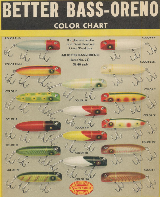 The South Bend Bass-Oreno (No 973) first entered the lure market in the mid 1910′s. As a lure it had a long lifespan being produced well into the 1960′s The lure had three treble hooks and was between 3 1/8″ and 3 3/4 inches in length. There are many variations to this lure.