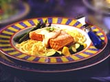 BOIL water and wine in a large skillet; add salmon. Reduce heat to low; cover. Cook for 8 to 10 minutes or until thickest part of salmon flakes easily when tested with a fork. PREPARE pasta according to