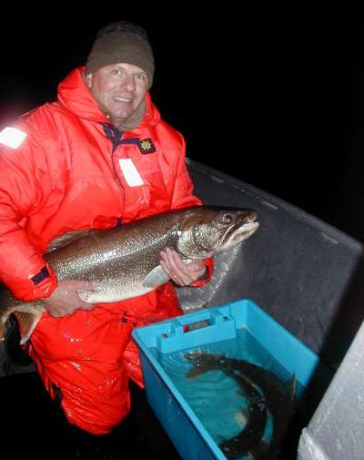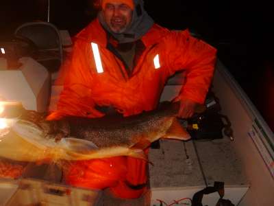 In the dark and cold of mid October lake trout were captured, measured and released from 3 sites in the Southwest Arm while only one of the lake trout sites in the Northeast Arm provided any lake trout activity. The largest lake trout captured during the 4 night project was a behemoth measuring approximately 106cm at the fork length and estimated to weigh well in excess of 25lbs. All 15 of the lake trout were successfully released upon the completion of sampling. While there is more work to be done next fall, particularly in the extreme northerly portions of the lake, a significant portion of the lake has been investigated. |