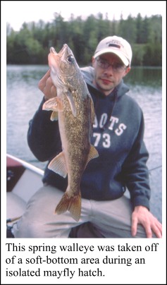 During spring feeding binges walleye are not as selective on baits matching-the-hatch as they in the summer. When spring fishing this season pay attention to water surface activity and look for isolated hatches. If near post-spawn staging areas, these spots might serve as feeding zones for recovering walleye. Fish them with jigs or slip bobbers and live bait. In an upcoming article, I'll share strategies on how to catch walleye in the summer during isolated and large-scale mayfly hatches.