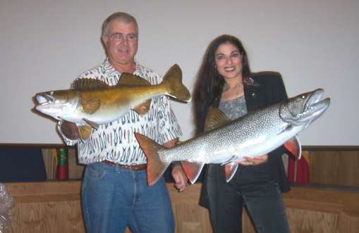 The winners of the 2004 Temagami Stewardship Councilís Trophy Live Release Contest were Wayne Yarrow of Temagami with his 11.5 lb. walleye and Terri Dickson of Ottawa with her 18.5 lb. lake trout. Terri and Wayne were guests at the Sept.26th meeting of the Stewardship at which time they were presented with the replica mount of their released trophy fish. The beautiful lifelike mounts were created by Advanced Taxidery of Toronto who sponsor the Stewardshipís effort to encourage anglers to release the prime spawners.