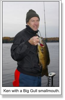 and south of Big Island. Lyon’s prefers bulky tubes when fishing the weed edges for largemouth, with live frogs also taking their fair share of big bass. I had success tossing crayfish-coloured flipping jigs on sand/rock structure, while flashy white spinnerbaits accounted for a few fish. Walleye are prominent in Skootamatta, and a twenty-inch average is the norm. “The walleye fishing is best during the spring and fall, although they have been caught regularly through the months all this year,” stated Don. Although I only spent one day targeting them, a few fish were caught in the west arm, adjacent to Killer Creek. White twistertails worked in fourteen-feet of water were the ticket. “Slow trolling small and flashy deep-diving Rapala baits are the most effective way of catching walleye that I have seen this year,” said Darren. Lyons seemed to concur, as his favourite walleye baits include jointed fluorescent red or chartreuse Rapala’s, double gold spinner rigs tipped with minnows, and chartreuse and white jig heads coupled with leeches. “When fishing during the summer, work the shady side of rock bars and shoals in less than twelve-feet of water. When the sun begins to dip, move up to water that is between 6 and 8-feet deep. And as fall rolls around, and after turnover is complete, concentrate on water deeper than twenty-feet,” stated Lyons. Good advice from someone with a twelve-and-a-half pound Skootamatta walleye to his name. Areas of mention are the west finger humps, the east side of Blake and Big Island and the trolling route between O’Borne Point and Big Island. Northern pike reign supreme in Skootamatta, and the smelt forage base coupled with deep water allows them to grow big and mean. Although I only came across hammerhandles during my brief stay, stories of a twenty-three pounder caught during a previous year certainly made my pulse quicken. “Pike were caught all year, although spring and fall are generally best. Live bait was the most effective, although spoons and plugs also caught their share of fish,” stated Don. According to Lyons, sucker or chub minnows, red and white spoons, Lucky Strike wooden plugs and large spinnerbaits all have their time and place. Spots he suggested were north of the Skootamatta River, in front of Killer Creek and adjacent to any of the deep scattered weedbeds. With four days passing quickly, and all four species firmly under my belt, the time had come to pack up my belongings and move on. Although I arrived during the most intense heat wave of the season, the fish were still co-operative. As I pulled the boat out, I whispered one last promise to Skootamatta – to most certainly return one day soon. Big Gull Located east of Skootamatta, and nestled in the Township of Frontenac, lies the expansive waters of Big Gull Lake. Surrounded by thousands of acres of Crown Land, remoteness in an easily accessible fishing spot is the first thing that comes to mind. Being the largest of the three lakes, Big Gull certainly deserves its name. At 5840 acres and covering 88.5-kilometres of shoreline, this lake can be overwhelming to the first timer, but don’t let that scare you away. Big Gull has the appearance of two lakes, a small one in the west and a larger one to the east. The west lake is quite shallow and tops off at approximately three-metres. Many locals refer to this portion of the water as Little Gull Lake. It was two days before Halloween when I decided to test these waters out, and my companion for the day would be none other than my father, Ken. As we made our way north up Highway 509, and cut west along Ardoch Road, the ominous clouds and cold temperature began to get our attention. Conditions would be tough, but optimism was the key word that day. A launch is located at the far eastern end of the lake, directly adjacent to Ardoch Road, and less than two-kilometres south of Coxvale. The concrete ramp was adequate for getting onto the lake, although parking was quite minimal. As we launched into the clear water and steered the boat west, deciding on a species to target would be our next big decision. Smallmouth bass and walleye were the obvious choice. Variety of fish is a nice aspect of this lake, as largemouth, northerns, musky and numerous panfish are also present. It didn’t take Dad long to get the first fish of the day. Working along the east side of Long Island with a four-inch twistertail and pink jig head, he set the hook into a chunky two-and-a-half pound smallie. This fish was holding just off a weedbed in four-metres of water. Jim Walker, owner of Kirk Kove Cottages, had this to say about the bass fishing: “Smallmouth bass are quite abundant here on Big Gull and will bite almost anything, but some of the most popular lures are plastic shads, twistertails (white), plastic crayfish and Senko-style baits. When it comes to live bait, leeches work well throughout the summer, with minnows and frogs taking over in the fall.” Tube jigs are a great bait for Big Gull smallies, as I discovered over the next two hours. Drag your bait along bottom, and concentrate on the numerous points, islands and shoals that litter the lake. Brown and smoke produced best. The average size smallmouth is in excess of two-pounds, and landing a fish greater than five-pounds is not uncommon. Pinnacle Point, Big Boundary Island and Upper Sister Island all deserve a cast. Largemouth bass are quite abundant throughout Big Gull, especially when targeting fallen trees, docks and weedbeds. “Largemouth fishing is good from opening day until mid-October,” stated Murray Finch, the proprietor of Camp’s Bay Cottages and Marine. “A seven-pound largemouth is the most momentous catch we’ve had at the lodge over the years.” Finch also said that spinnerbaits and surface lures work well for the bass here, although live bait can never be forgotten. My father and I got into a few largies that day, but nothing of great size. Although it was too lat
