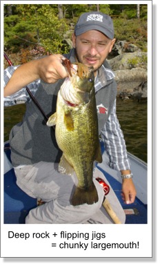 the Largemouth of FallBy Justin Hoffman Hunting trophy largemouth can be one heck of an addictive sport. The pursuit demands patience, stamina, and the utmost in determination. And although wading through two and three-pounders is fun unto itself - it is sliding your net under that rare giant of a fish that truly makes this obsession worthwhile. A Time of Change As summer transitions into fall, a series of changes begin to take place. Bright crimson hues take hold of flag-waving leaves, while lake water begins to slowly dip in temperature. The pesky biting bugs have all but disappeared, as have the fair-weathered weekend warriors. But a change is also occurring within the resident largemouth. Sensing the impending arrival of the winter food drought and dormant stage, bass are beginning to feed heavily, bingeing on prey and rapidly building up fat reserves. Location is Key If I could have one common ingredient when chasing fall largemouth, it would definitely be the presence of rock. The reason behind this is two-fold. Crayfish are an integral part of the largemouth diet. And what better place to find these high caloric snacks than in the place they call home. The other important factor is heat. Acting like a magnet in attracting and holding the skyward sun, rocks provide a thermal layer of warmer water that largemouth bass instinctively gravitate to. Rock comes in all shapes and sizes, but over the years I've found a few variables that are worth keying in on. Slab rock is one. These large stone "tables" will often find fish holding on top, or just off the edge where it meets deeper water. A collection of boulders, pebbles, slab, and chunk are also prime real estate pieces. Wood, in conjunction with rock, is also a target when seeking out fall bass. Although large laydowns will frequently hold fish, I've found that the mere presence of a stick or branch is enough to attract and hold a fish on a spot. Docks that are situated over deep rock are another favourite structure area, and often harbour big fish within their secretive lair. Where To Start ![]() Deep-water lakes make prime candidates for fall largies, whereas shallow, fertile lakes are generally a poor choice. Many of my top lakes average 60 to 100-feet deep, and are almost entirely made up of rock and rubble. Start with shorelines that drop into deeper water fairly quickly. The kind that has the boat twenty-feet from shore and the sonar reading 30-feet deep. It is then a matter of working your way around a lake, seeking out areas that were discussed previous, and pounding them into submission. There is no perfect depth for finding largemouth in the fall, but if I could narrow it down, I would put my most effort into water that fell between three and 15-feet deep. Don't dismiss those warm days that routinely crop up in September and early October. Although still classed as fall time, some of my better days have been when the sun has shone and the shorts came out. Sunny days will often find fish shallow - especially in chilly weather - while rough or stormy days see them drop a bit deeper. All