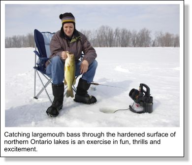 Largies Through the Ice”By Justin Hoffman Author’s Note – Ice fishing for largemouth bass is a legal sport in many parts of Ontario. Currently, Zones 2, 3, 4, 5, 6, 7, 8, and 9 offer a year-round fishery for this specie. The season closes on December 31 in Zone 11. Please check your regulations carefully, paying attention to any restrictions, size limits, or closures. DO NOT fish for bass where it is illegal to do so. Catching largemouth bass through the hardened surface of northern Ontario lakes is an exercise in fun, thrills and excitement. While most ice angler’s turn to panfish or walleye to whet their appetite, those that are searching for line-peeling pulls and hefty weights need look no further than old greenback himself. Understanding locational factors and on-ice techniques will get you into the thick of things, while also creating a never-ending bass season for those willing to give it a try. You gotta love that! The “Fall Factor” The first step to locating winter largemouth, is to determine the areas you caught them from during the late fall. Once the ice sets, most largemouth won’t stray far from these patterns, mainly preferring to hang around the outside weed edges that form along breaklines, and in and around the perimeter of weed-choked bays. Think of the same places you pitched a heavy flipping jig while the leaves changed color, and you’ve got your starting point. The most important part of the cold-water equation is weed growth. Cabbage is the first choice, and vegetation such as this will stay green through most of the season. Baitfish will relate to this underwater salad, both for the microorganisms it provides, as well as the influx of oxygen. This in turn keeps the largemouth fairly confined, for the protection, food and H2O. The thicker the weed the better. Largies will cling to this salad, snuggle up inside it, or patrol the edges, all depending on their mood that day. Regardless of where they are found in the vegetation, they can all be caught with the right tactics. Starting Out Figuring out where to drill holes is your first step when out on the ice. With the advent of GPS units, many anglers are marking productive waypoints during open water, for which to return to once the surface stiffens up. If you have this tool at your disposal, your fall bass excursions should become a time for recording your hotspots. Without a GPS, the task is left to the wonders of the auger. Start drilling holes out from shoreline areas. You are searching for both weedbeds and edges. Electronics, such as a Vexilar unit or underwater camera can help in simplifying this task. Once you have come in contact with the green stuff, position your holes